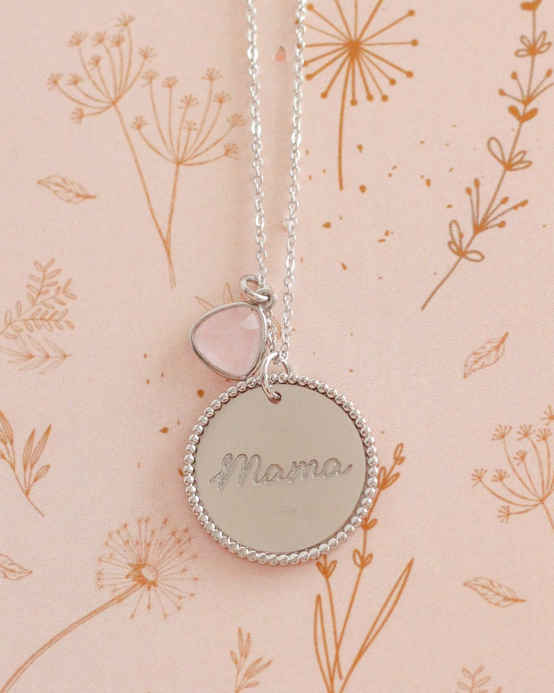 Elegante gargantilla que combina una medalla clásica de cuentas y una calzedonia rosa. Posee una preciosa tipografía manuscrita, fina y delicada, que refleja el carácter tierno y bondadoso que una madre transmite. Es nuestra joya más femenina y dulce, ideal para mamás de cualquier edad.