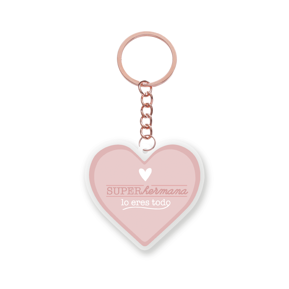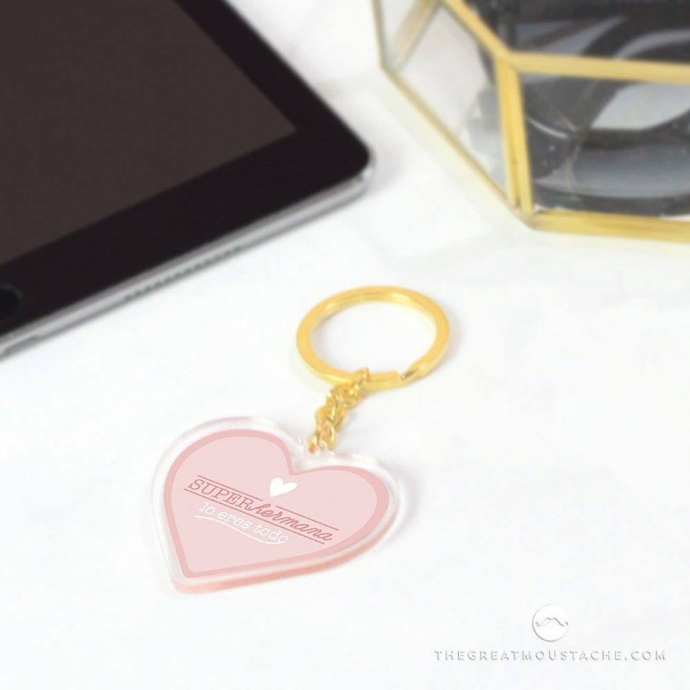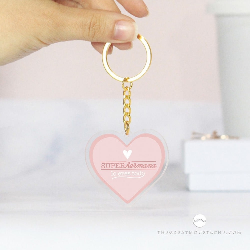 Llavero de metacrilato transparente. Impreso a todo color con el texto "Superhermana, lo eres todo".