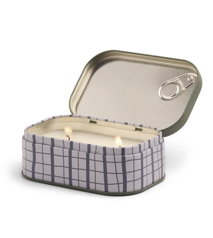 Velas de lata de dos mechas de 4.5 oz. | Con una lengüeta falsa para un carácter adicional inspirado en las latas de sardinas, estas velas de lata con ilustraciones ilustradas a mano ofrecen un brillo acogedor con sus dos mechas y un aroma reconfortante.