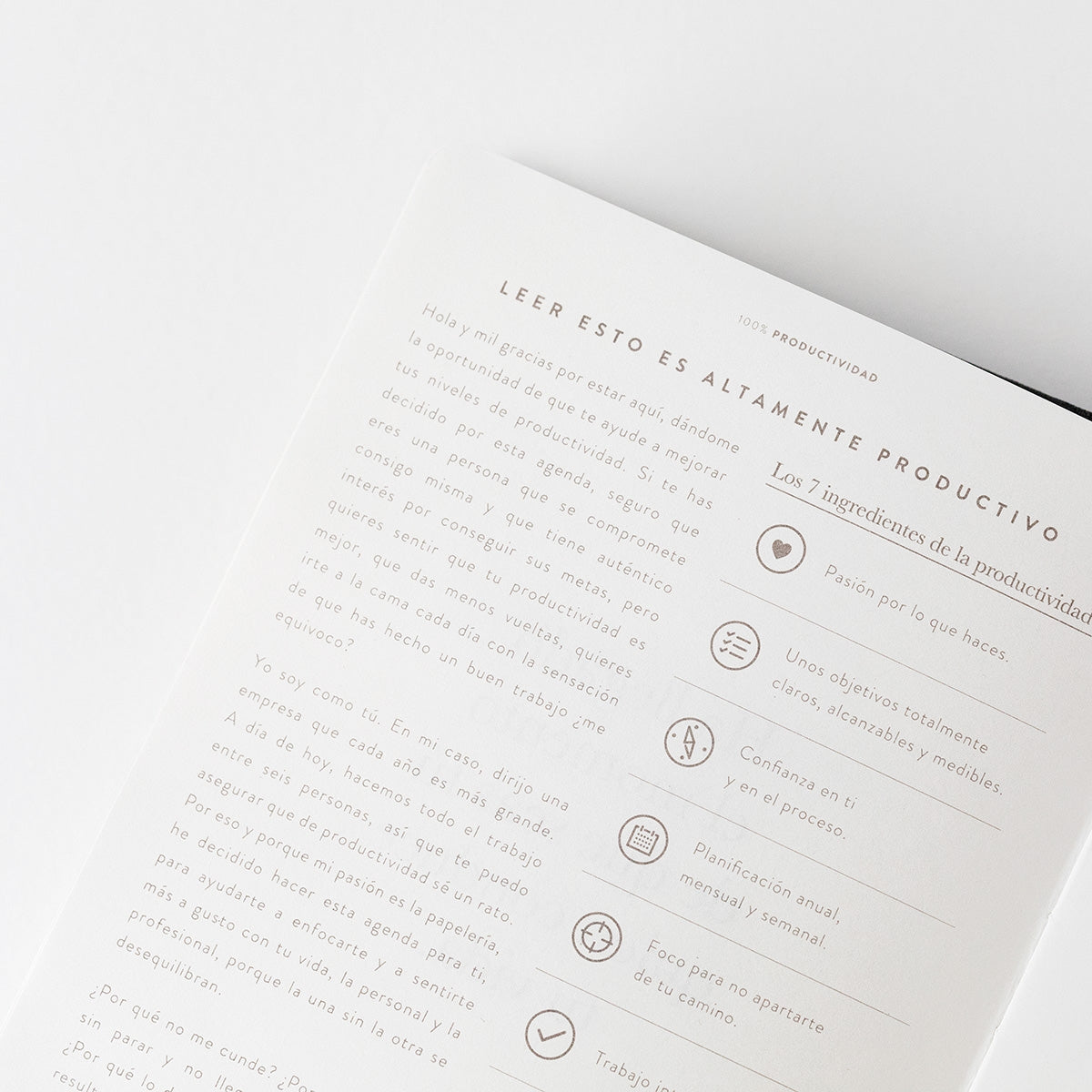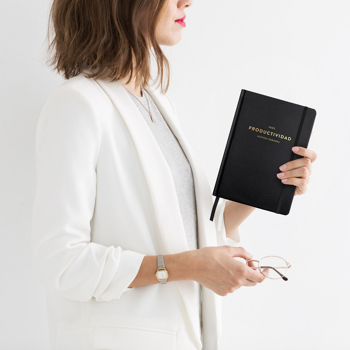 100% Productividad es una agenda semanal que te irá guiando y enseñando a dejar de trabajar a lo loco para empezar a trabajar con un propósito y con tus prioridades claras. Es una agenda sin fecha, la puedes empezar hoy mismo y utilizarla todo el año o reservarla para épocas en las que necesites máximo enfoque.
