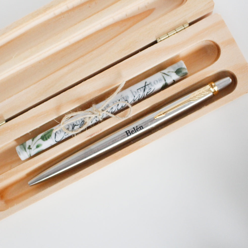 La abres y encuentras un bolígrafo Parker de acero inoxidable, para nosotros de las mejores marcas de escritura, muy especial y con una larga trayectoria que marcan la elegancia y excelencia desde el año 1888.