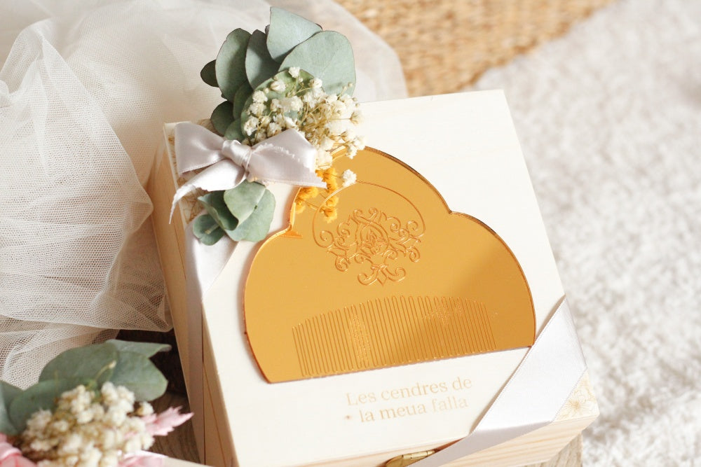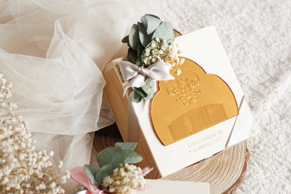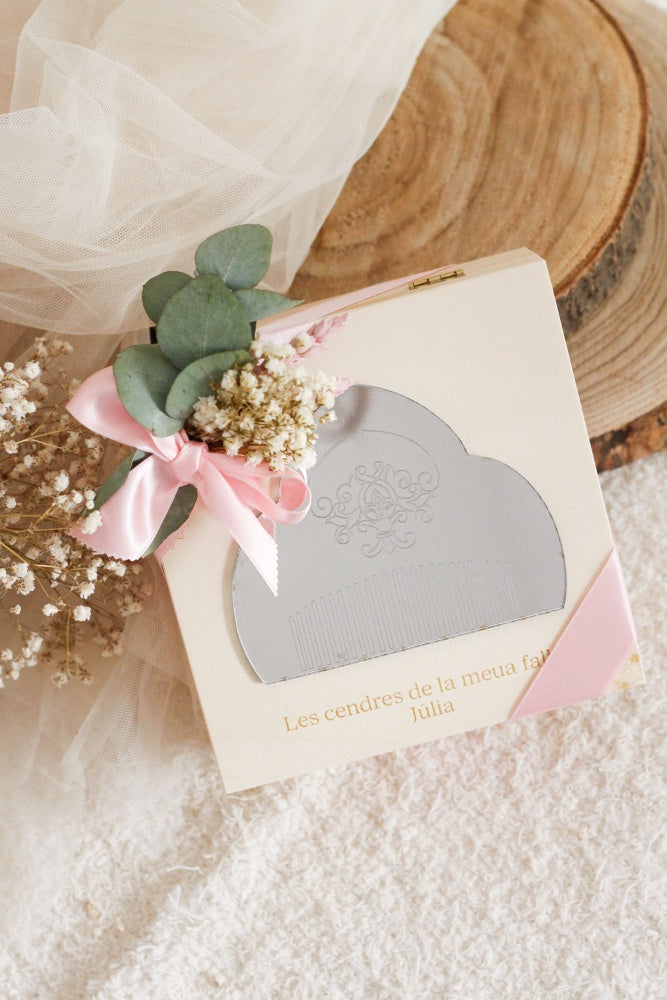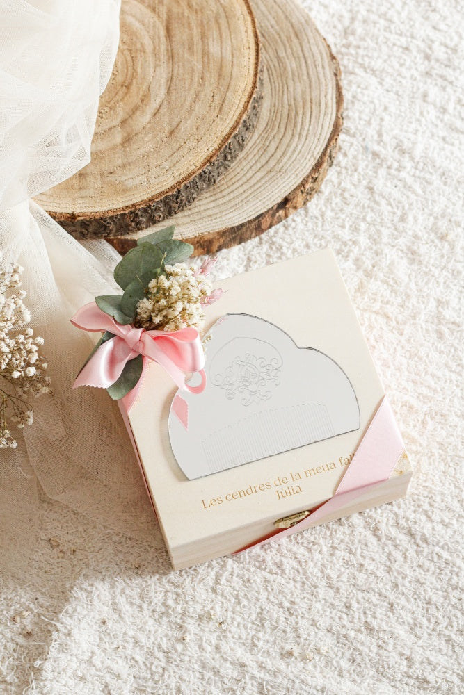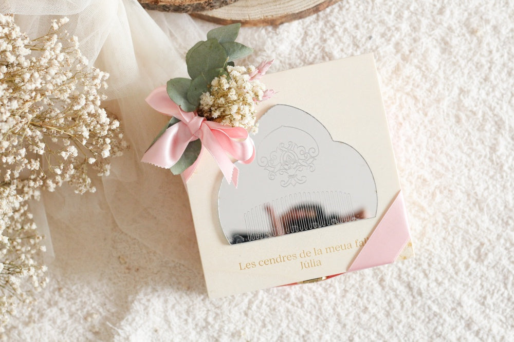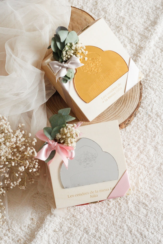 Incluye dentro decoración floral y bolsita de algodón para las cenizas.