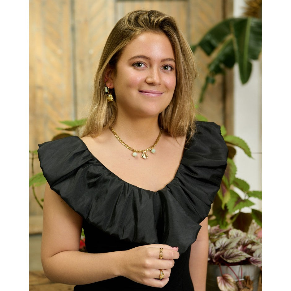 Cadena de acero dorado con mini charm en forma de pez y bolitas en tono verde agua