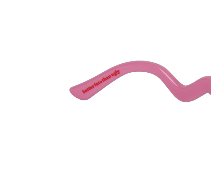 Con su diseño rosa y sus patillas onduladas rojas, estas gafas de sol para mujer 🕶️ son ideales para darle toque moderno y colorido a tu outfit. Además, con su mensaje “better late than ugly” 💄en el interior de una de las patillas te recordará que es mejor llegar a sin arreglar. ¡Y si te olvidas de tus gafas, sin duda volverás a por ellas!