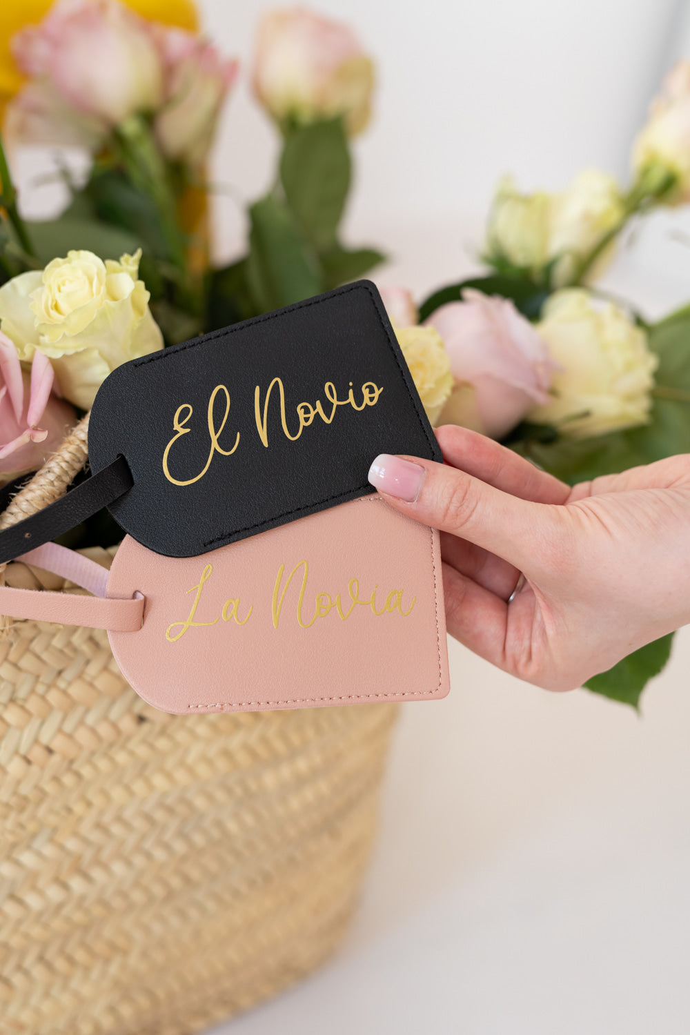 Etiquetas identificadoras de maleta con el mensaje El Novio y La Novia😍