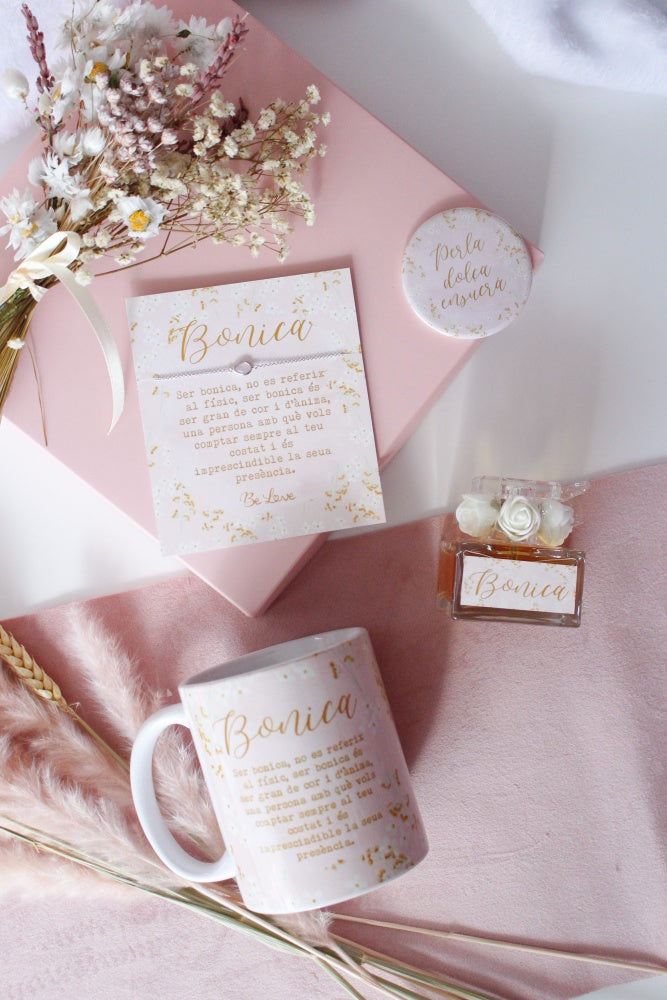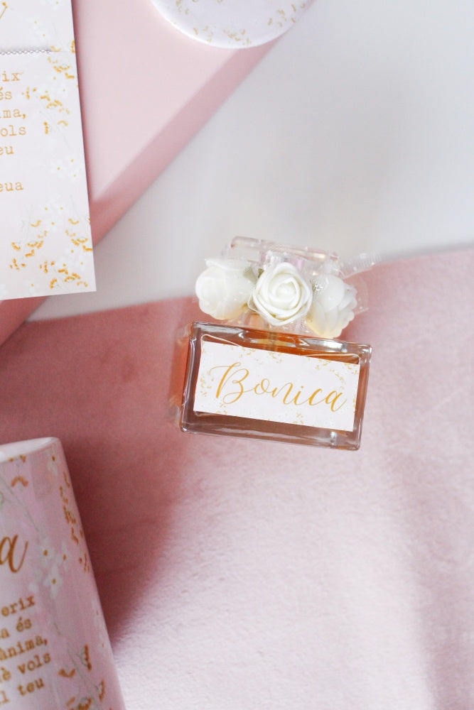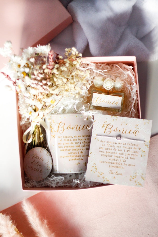 Tot presentat en una capseta rosa junt amb flors seques com a margarides, glixies, lavanda i paniculata.