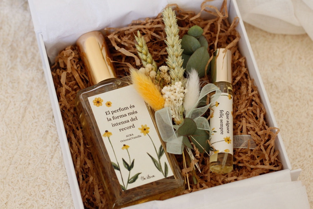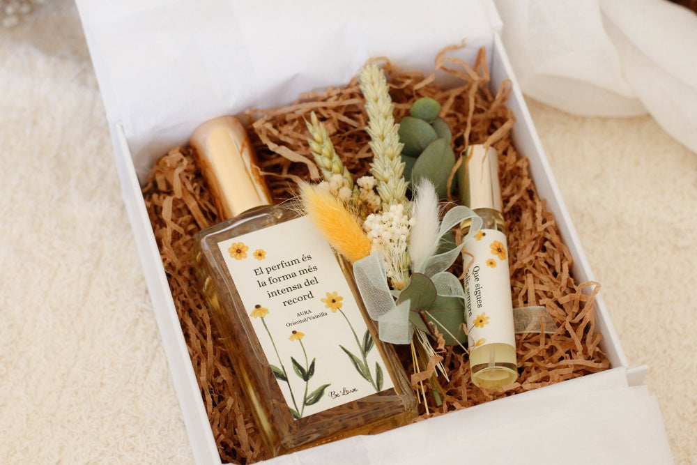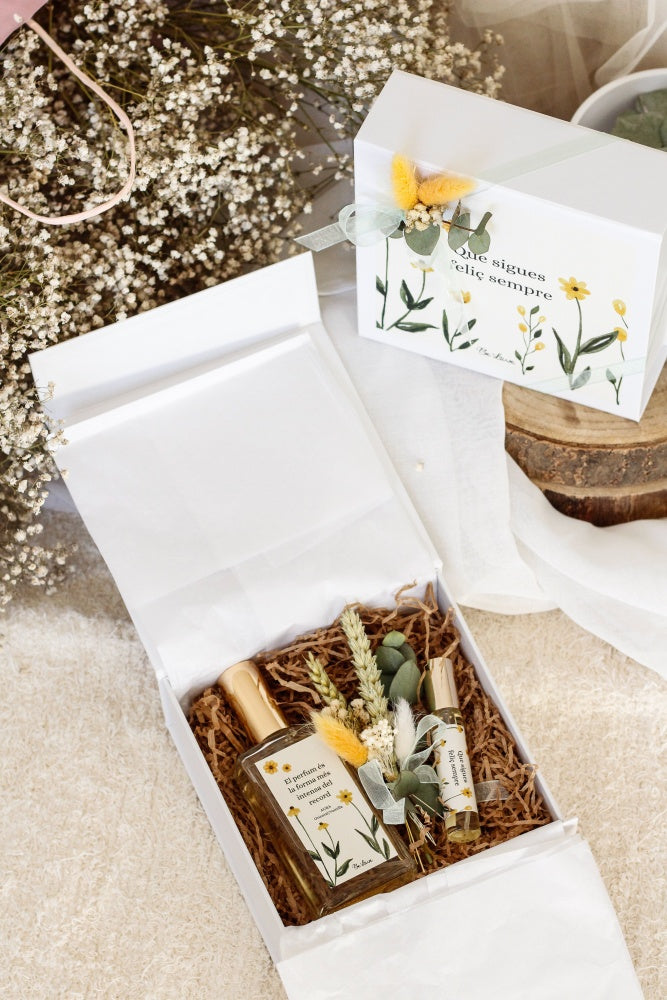 El kit inclou perfum de 100 ml i perfum de 10 ml perfecte per a la bossa, muntat en una preciosa capseta imantada amb un pom floral.