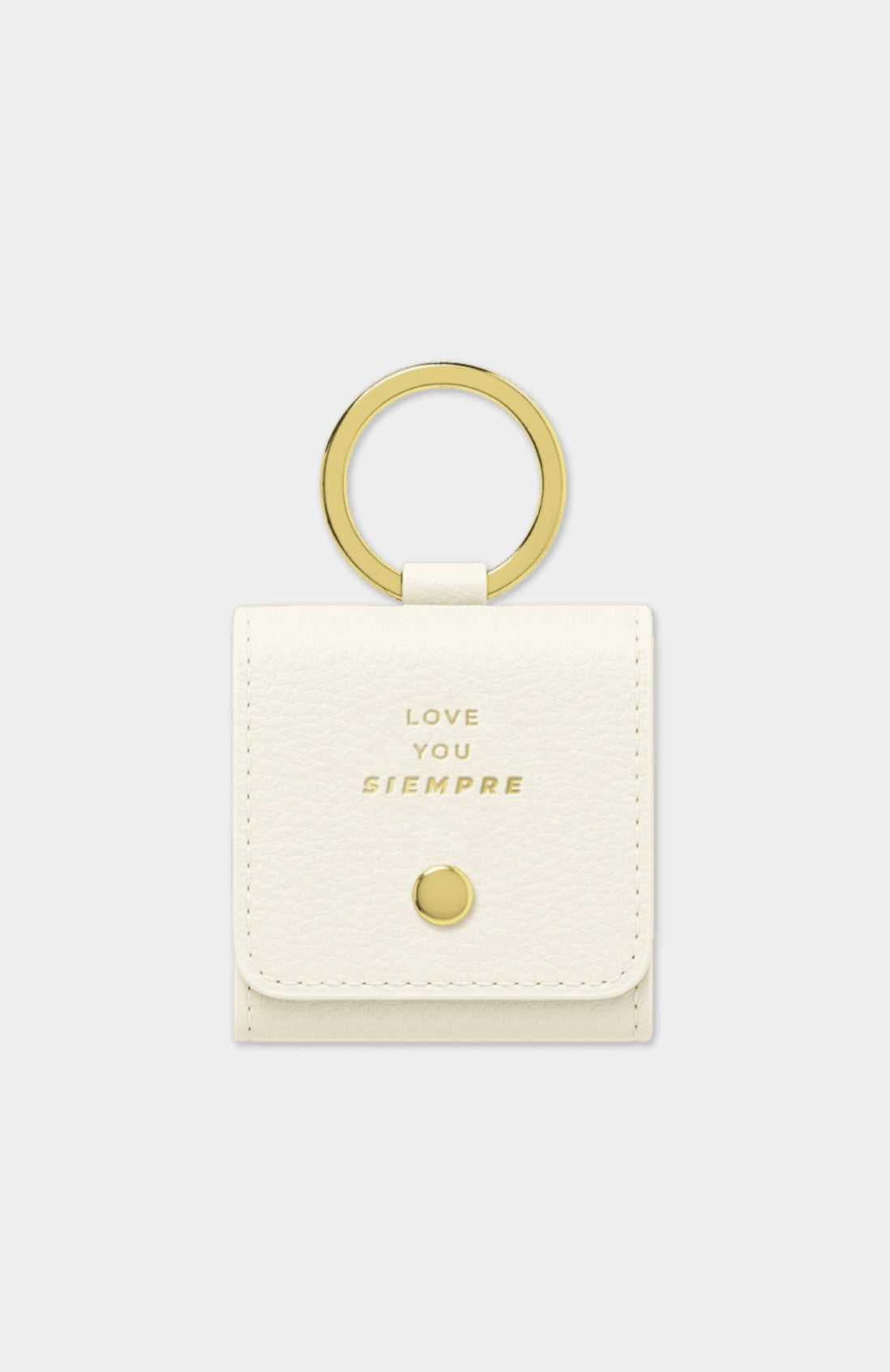 En su exterior, las palabras en dorado “Love you siempre”, grabadas sobre cuero vegano con cierre de corchete.