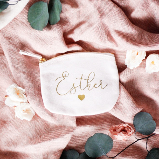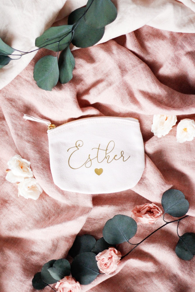 Monedero en 100% algodón orgánico con cierre de cremallera, en color rosa claro con letras en dorado.