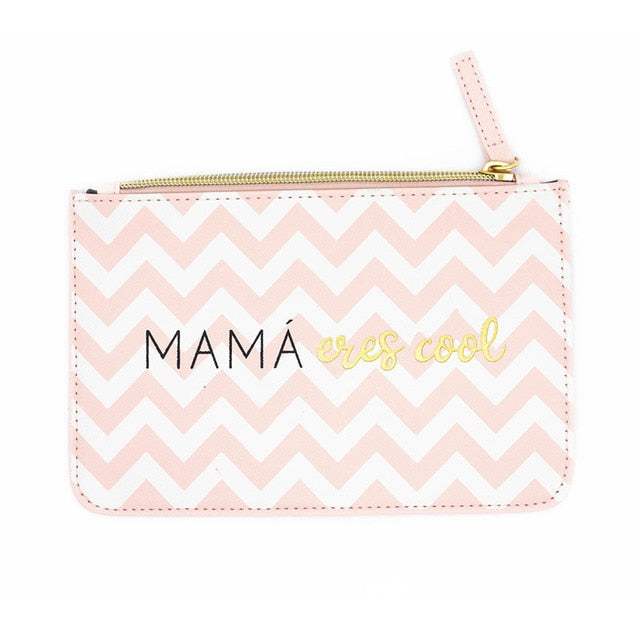 Neceser compacto y rectangular 13x20 ideal para productos de pequeño tamaño y fácil de transportar en un bolso de mano o maleta. Hecho con materiales de primera calidad en color blanco-rosa con detalles negro-dorado y cremallera superior acompañado de un texto impreso en el que se puede leer: "mamá eres cool".