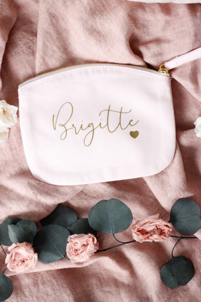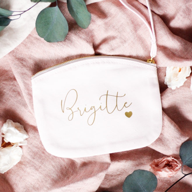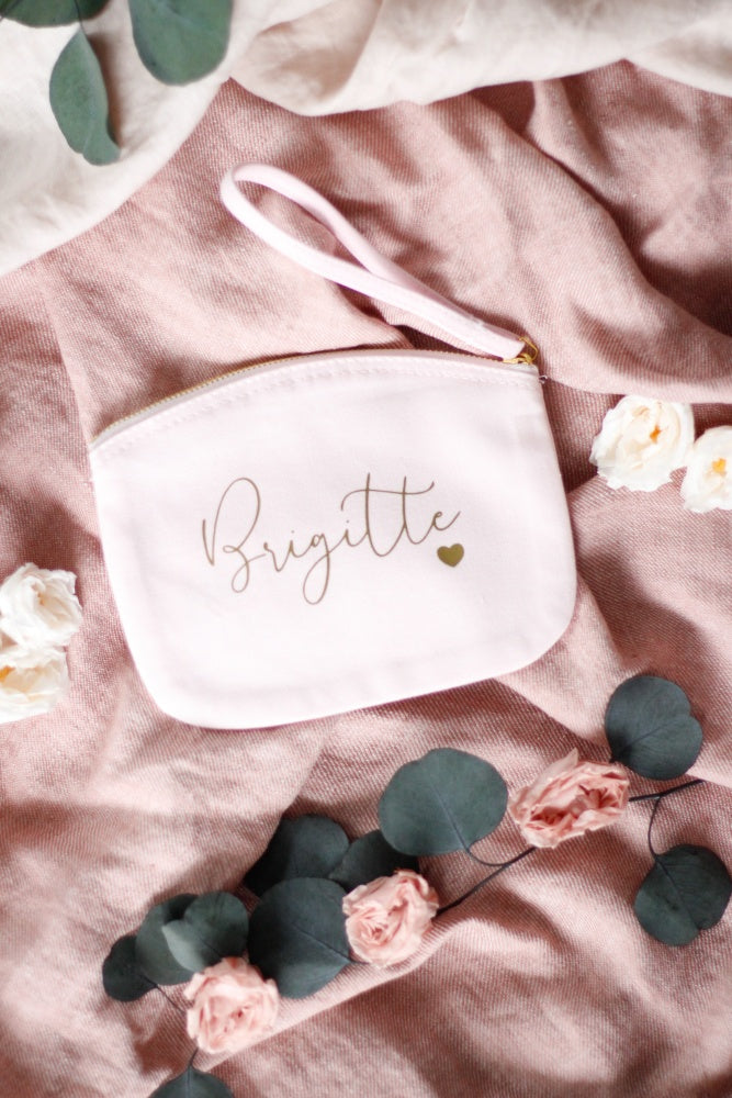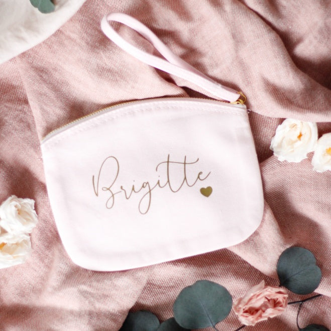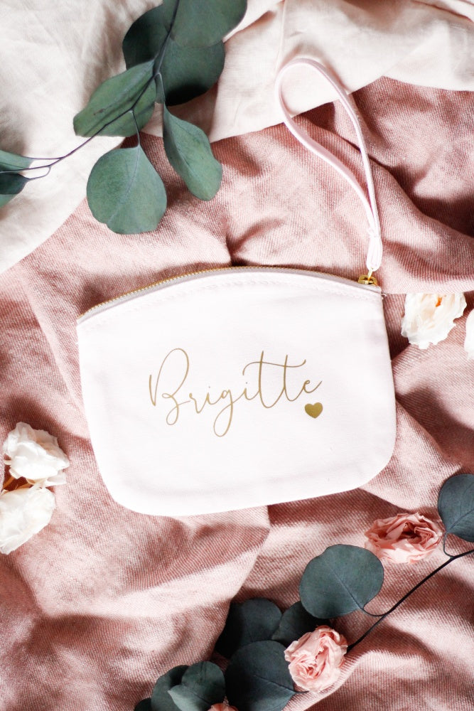 Neceser multiusos en color rosa clarito y las letras en dorado, incluye cinta para colgar de la muñeca y usarlo más cómodamente.