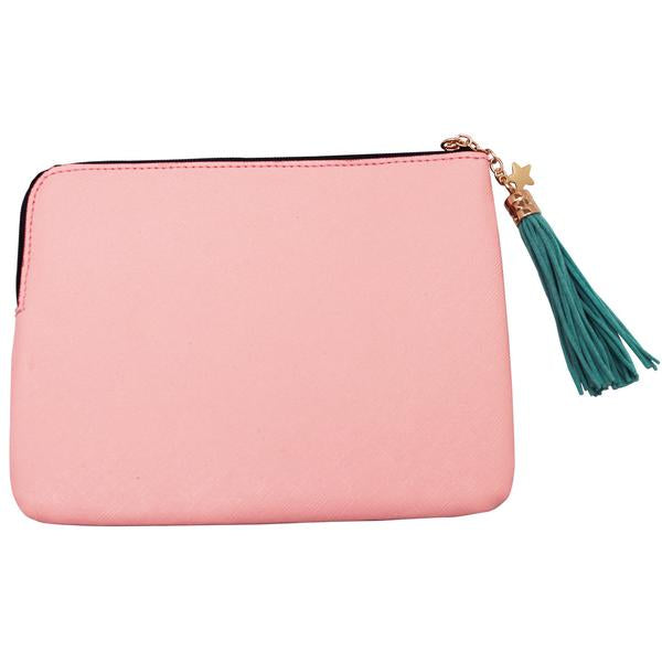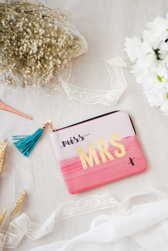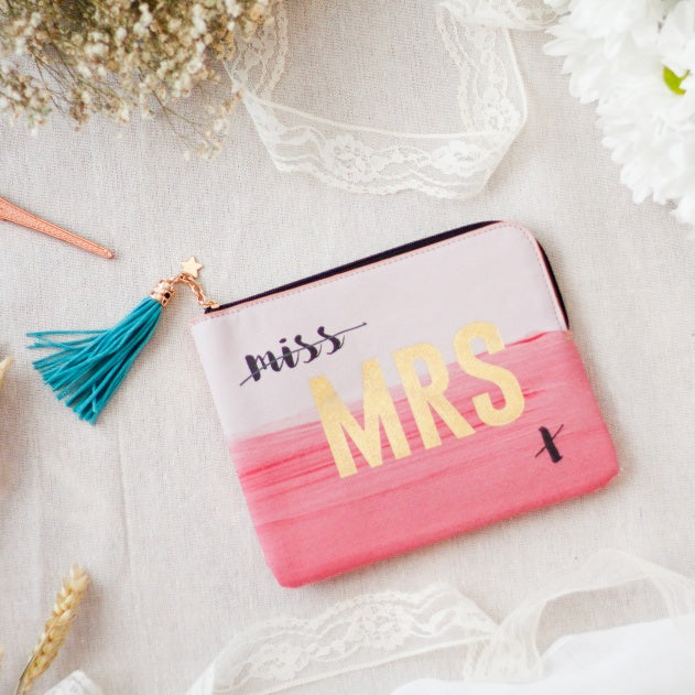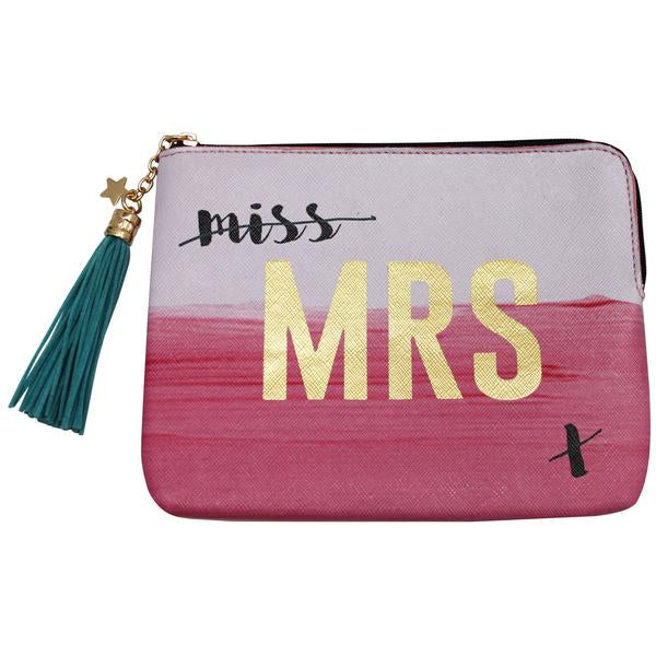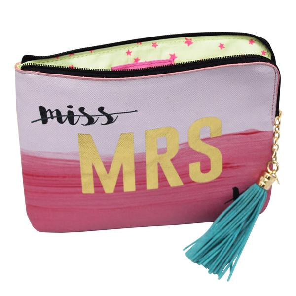 Estuche con cremallera "MRS" de House of Disaster Ta-daa. Charm de metal y borla efecto ante. Presenta colores rosa con efecto pincel con letras negras y doradas. Terminado con un dije de estrella de metal dorado y una borla de efecto ante turquesa. Disponible compacto "" Blushing Bride "". Interior de nailon verde contemporáneo con estrellas rosa neón. Incluye caja de regalo de artesanía impresa con bonitas estrellas rosas y doradas.