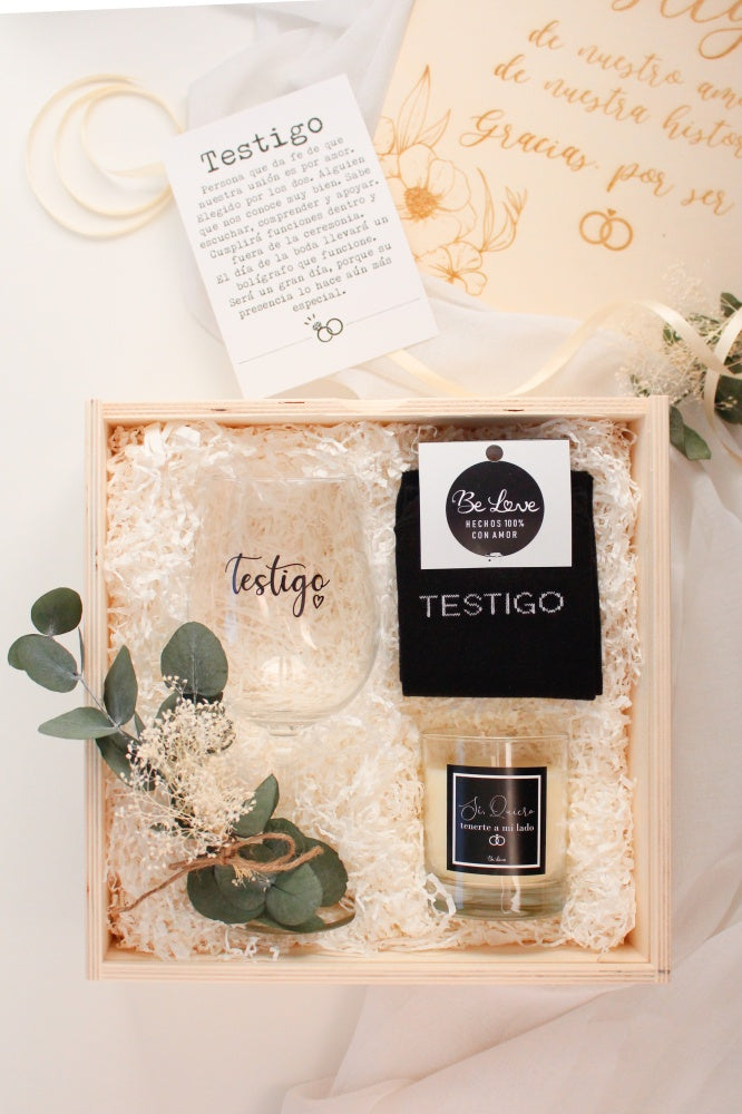 Todo presentado en una caja de madera grabada con el texto que tú quieras.