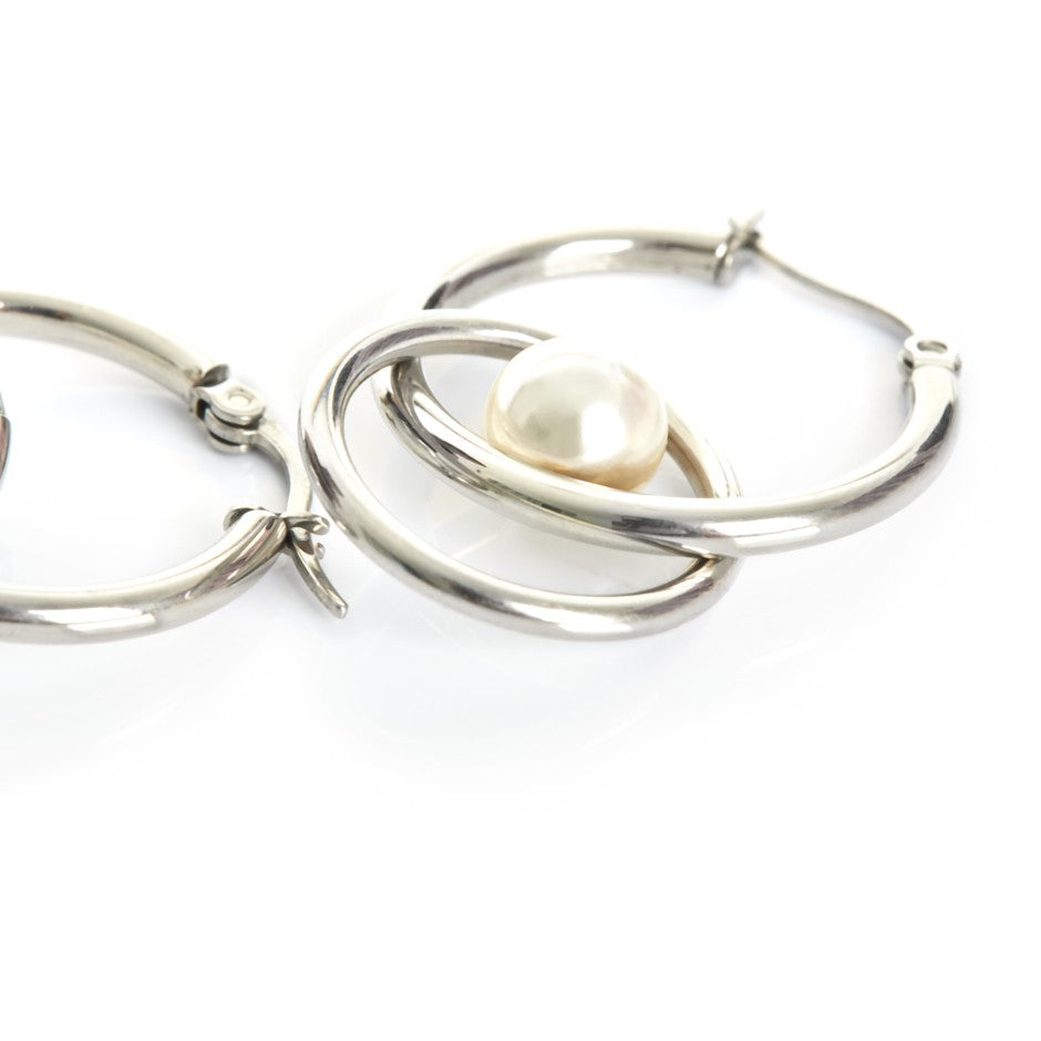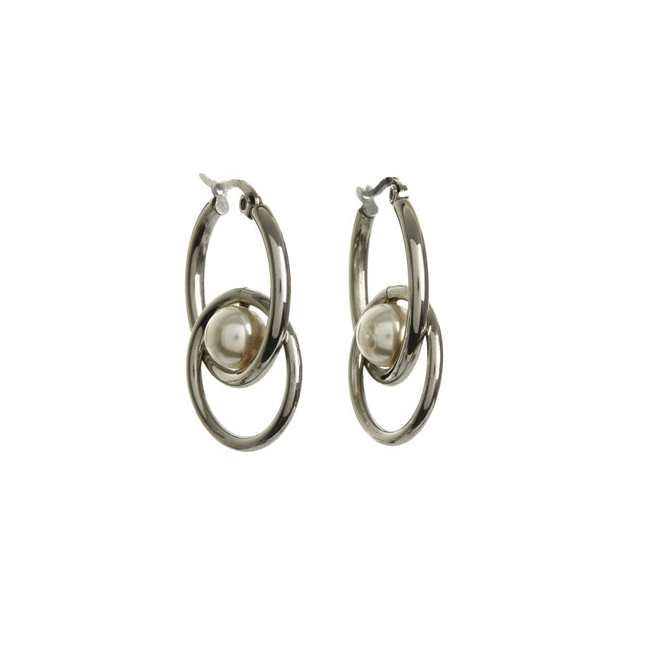 Pendiente de acero con forma de aro color plateado. Doble aro entrelazado y adorno perla