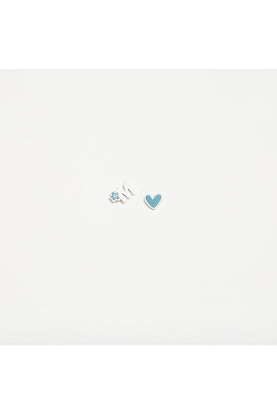 Pendientes abecederaio, letra M con una flor celeste esmaltado y el pendiente que hace pareja es un corazón con esmalte en el mismo color.