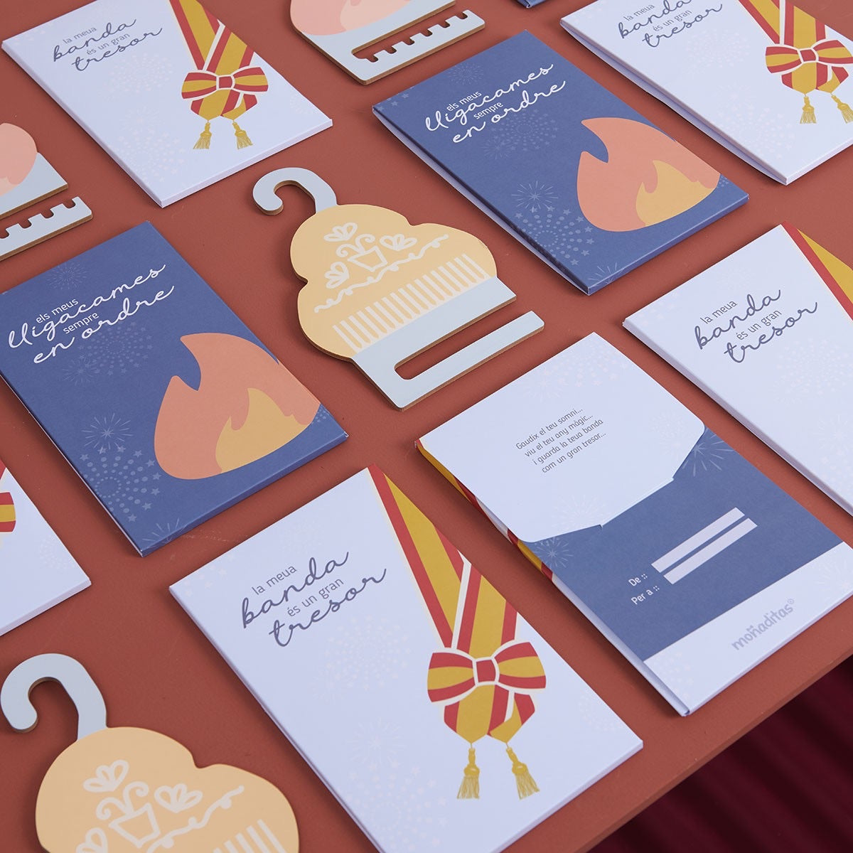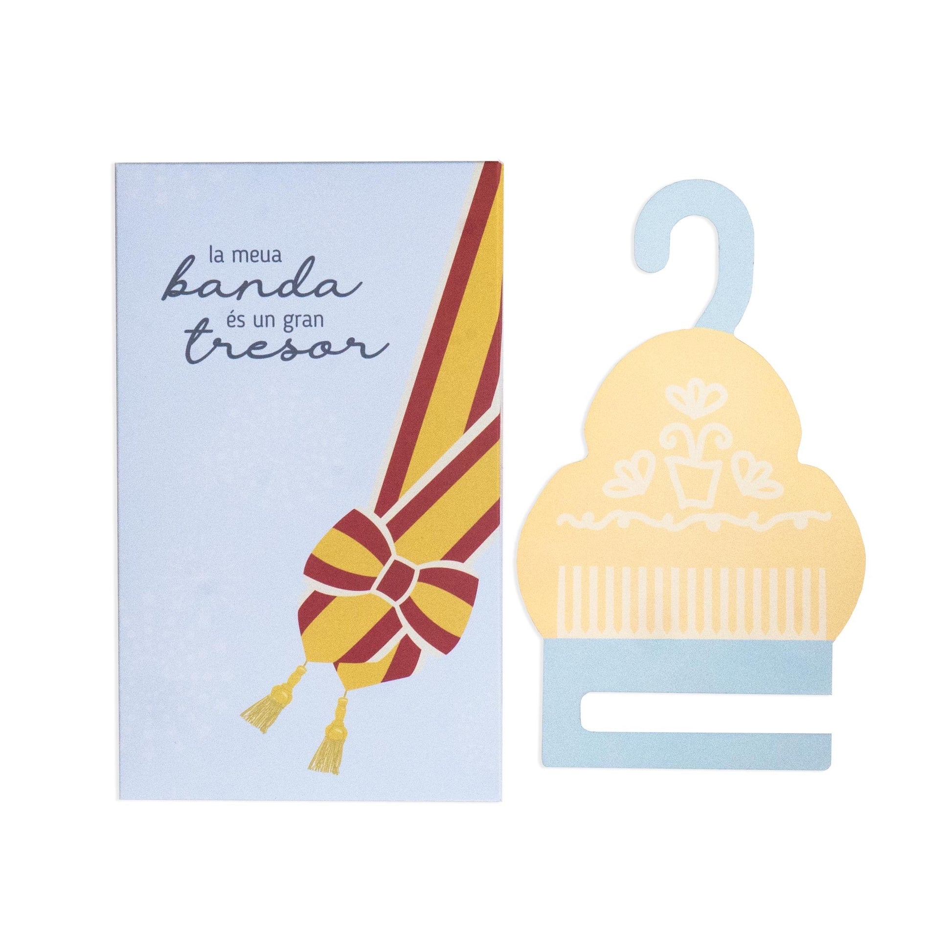 La percha viene empaquetada en un sobre de cartón con el dibujo de una banda de Fallera Mayor y tiene una zona en la parte trasera para poder poner una dedicatoria y tu nombre o de la persona que hace el regalo.