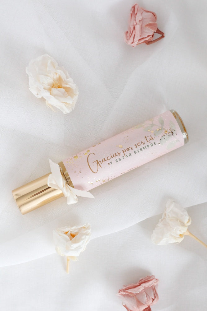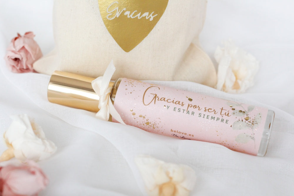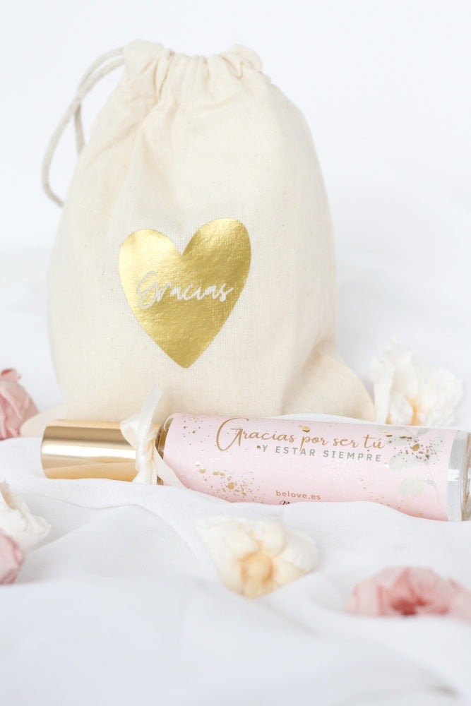 Perfume de 50ml con el mensaje Gracias por ser tú y estar siempre, dentro de una bolsita de algodón con el mensaje Gracias, dentro de un corazón.