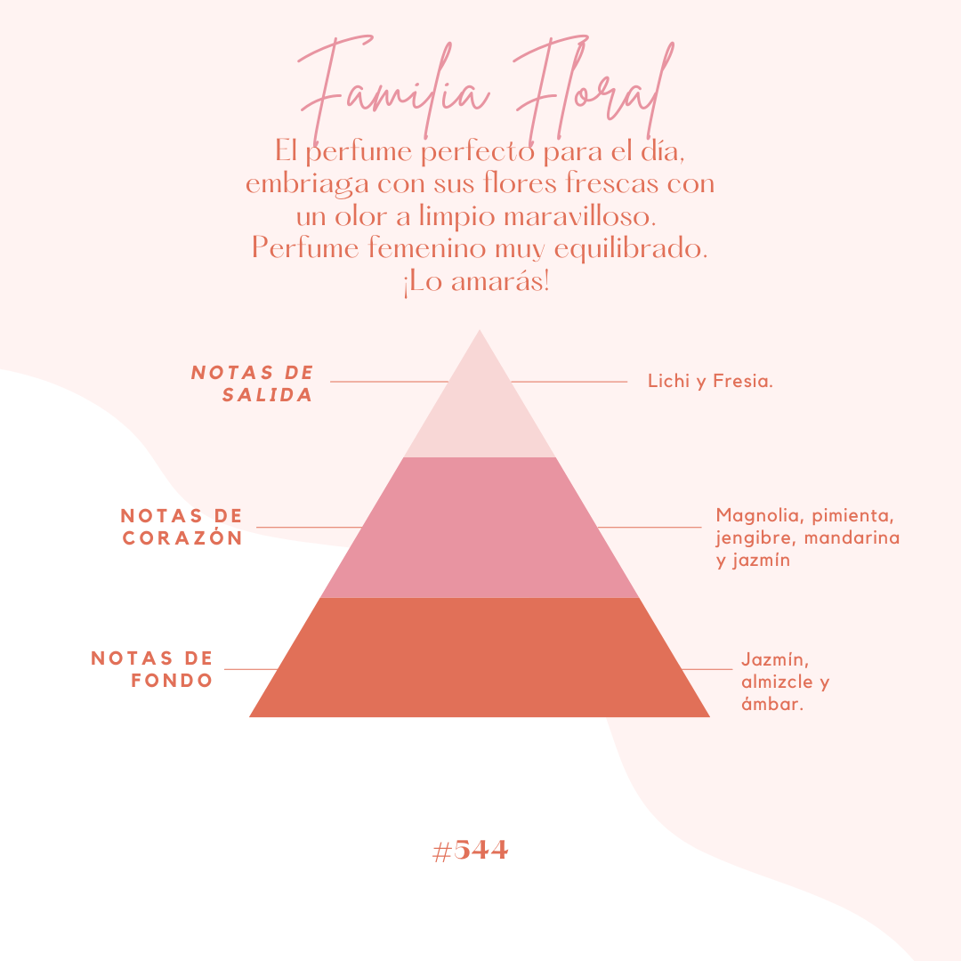 Las Notas de Salida son lichi y fresia; las Notas de Corazón son magnolia, pimienta, jengibre, mandarina y jazmín; las Notas de Fondo son jazmín, almizcle y ámbar.