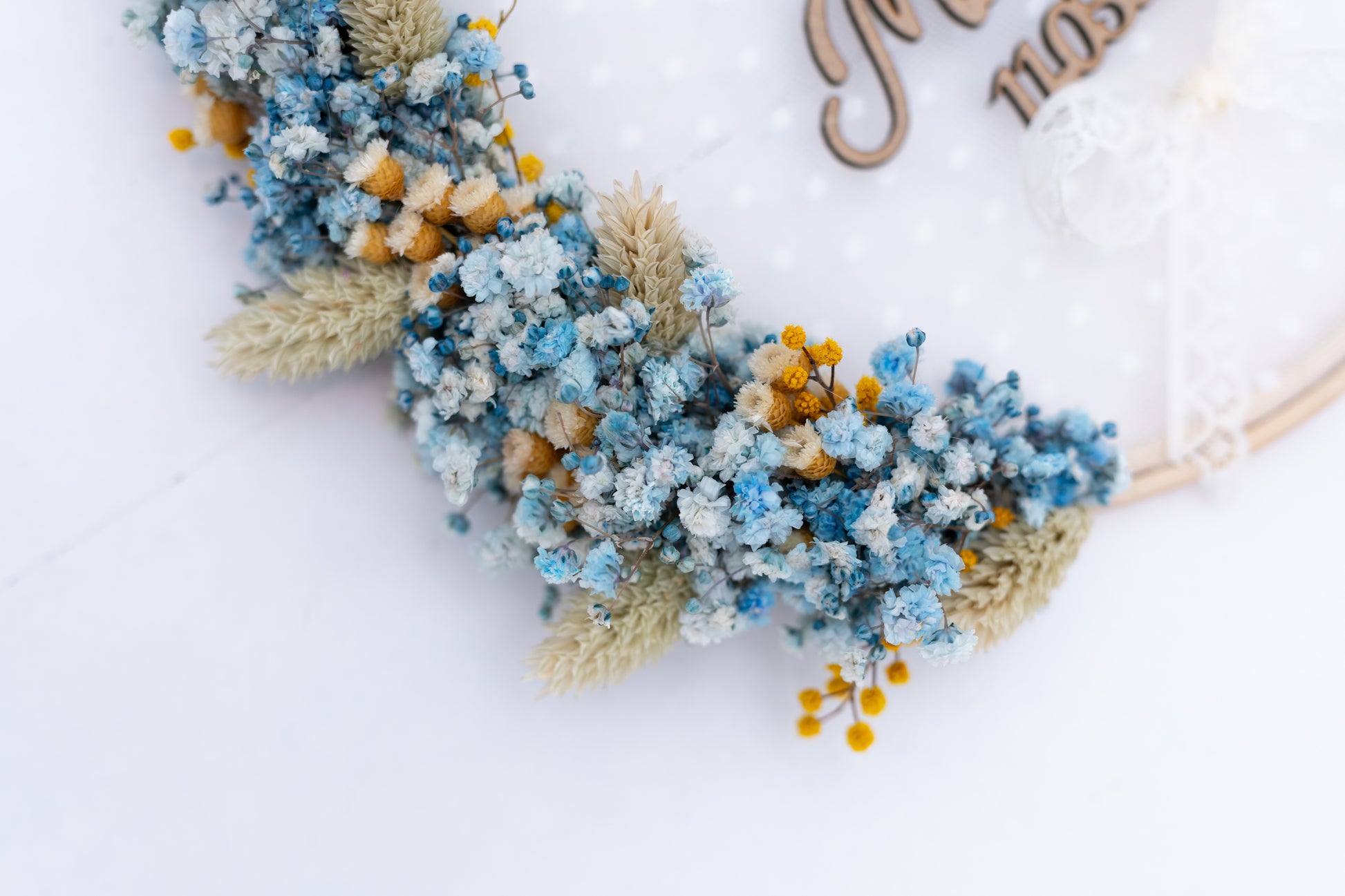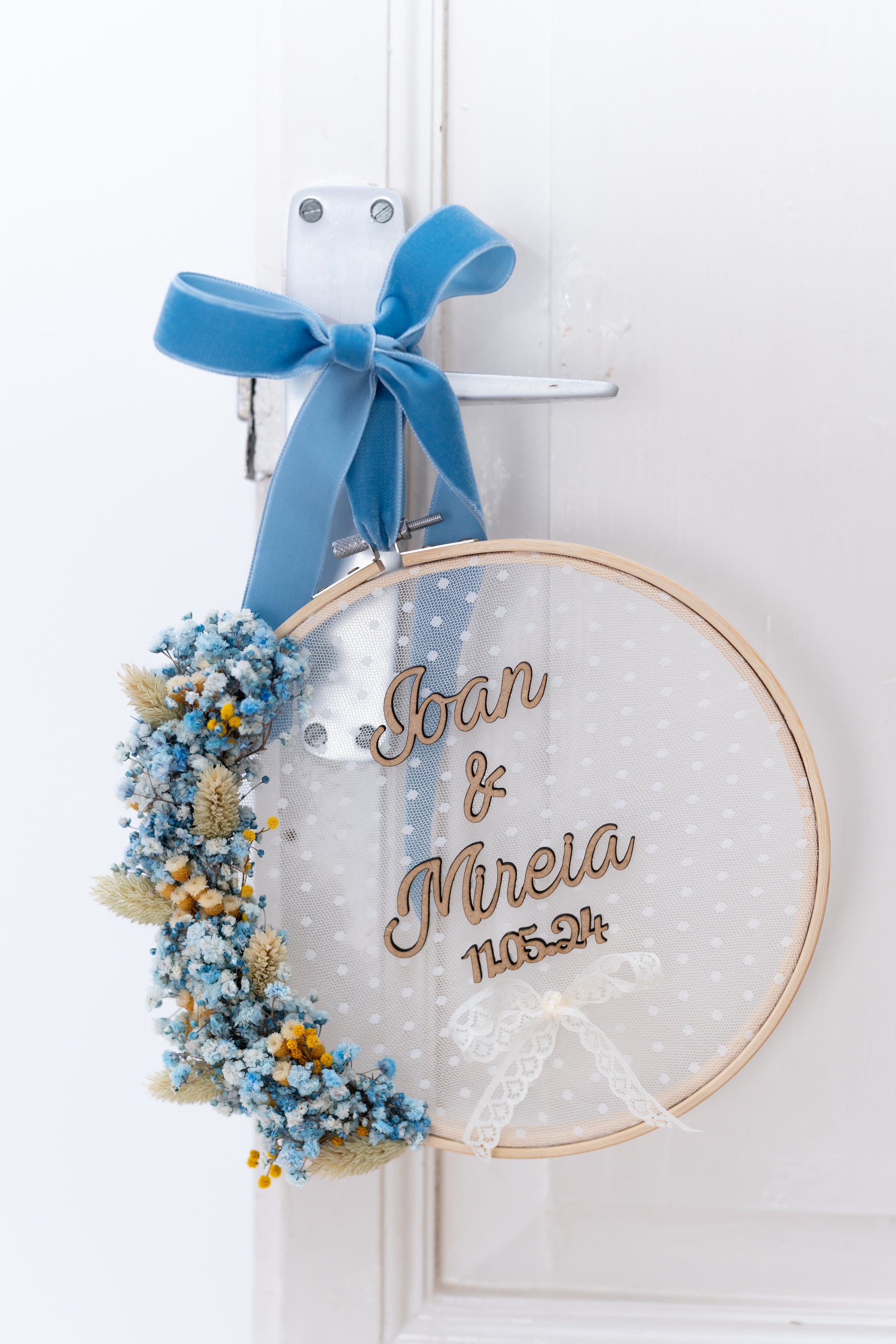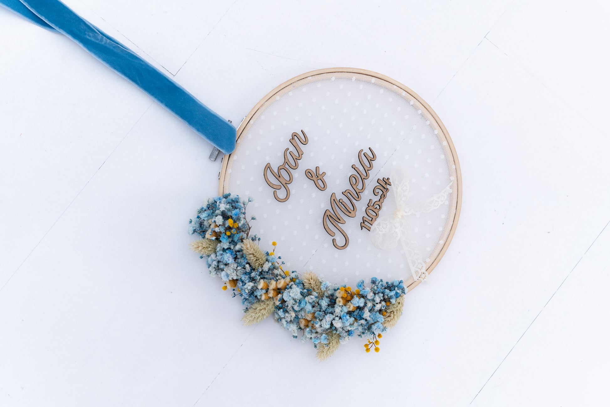 Este diseño hecho con paniculata azul, mimosa y jacilda reflejan una historia de amor llena de vida.