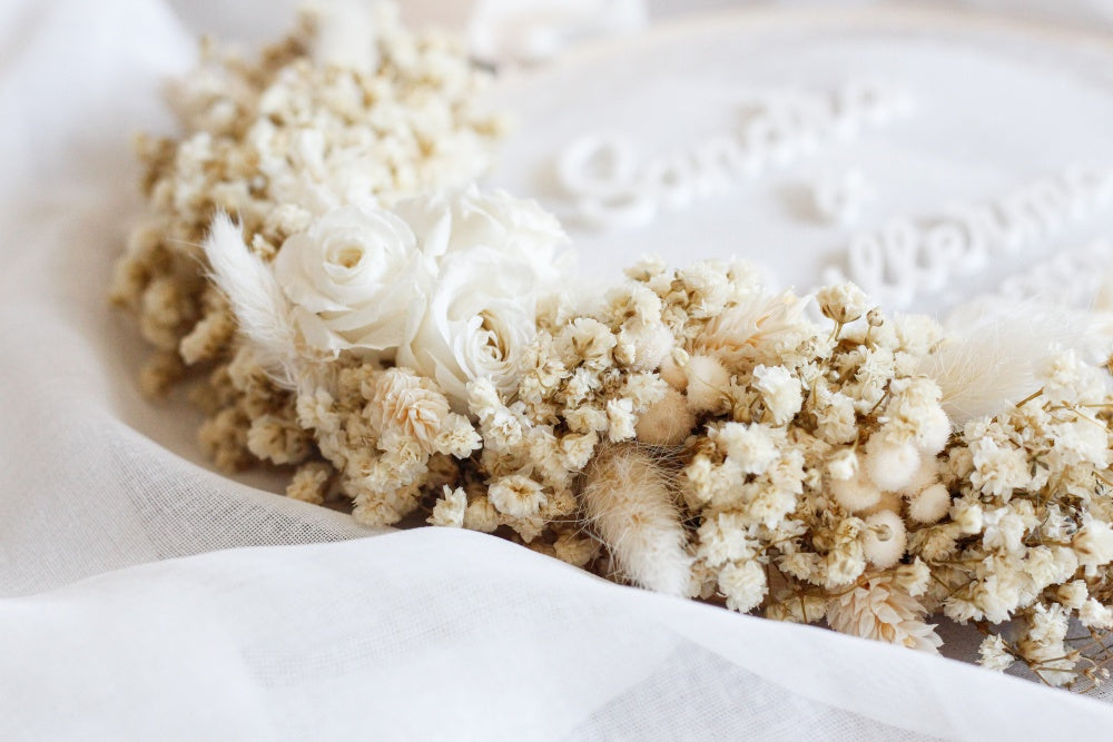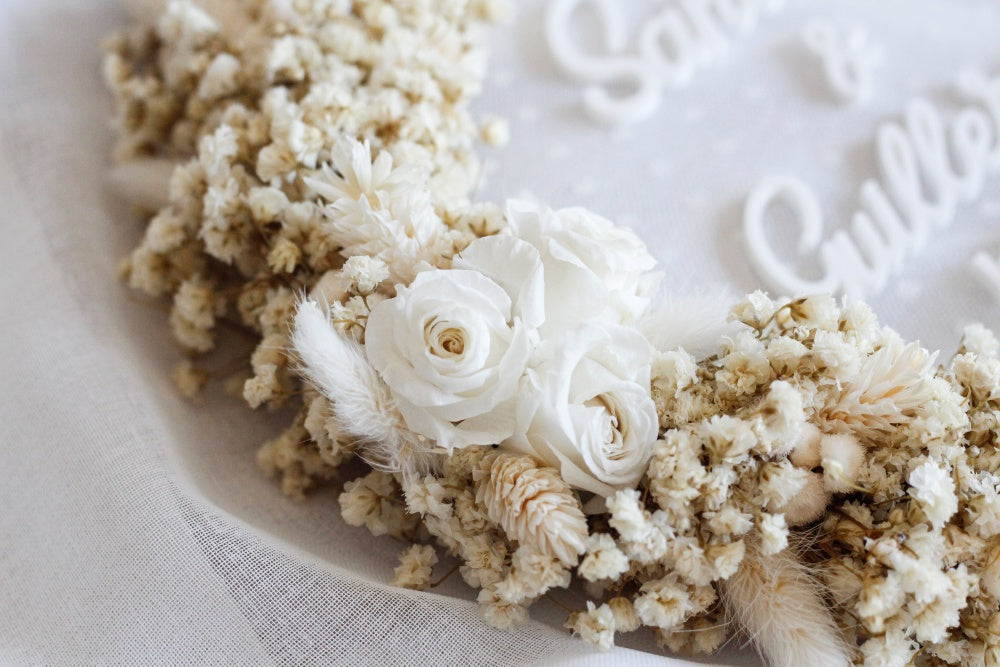Este diseño hecho con paniculata preservada y 3 rosas blancas minis preservadas refleja la dulzura, el romanticismo y la elegancia.