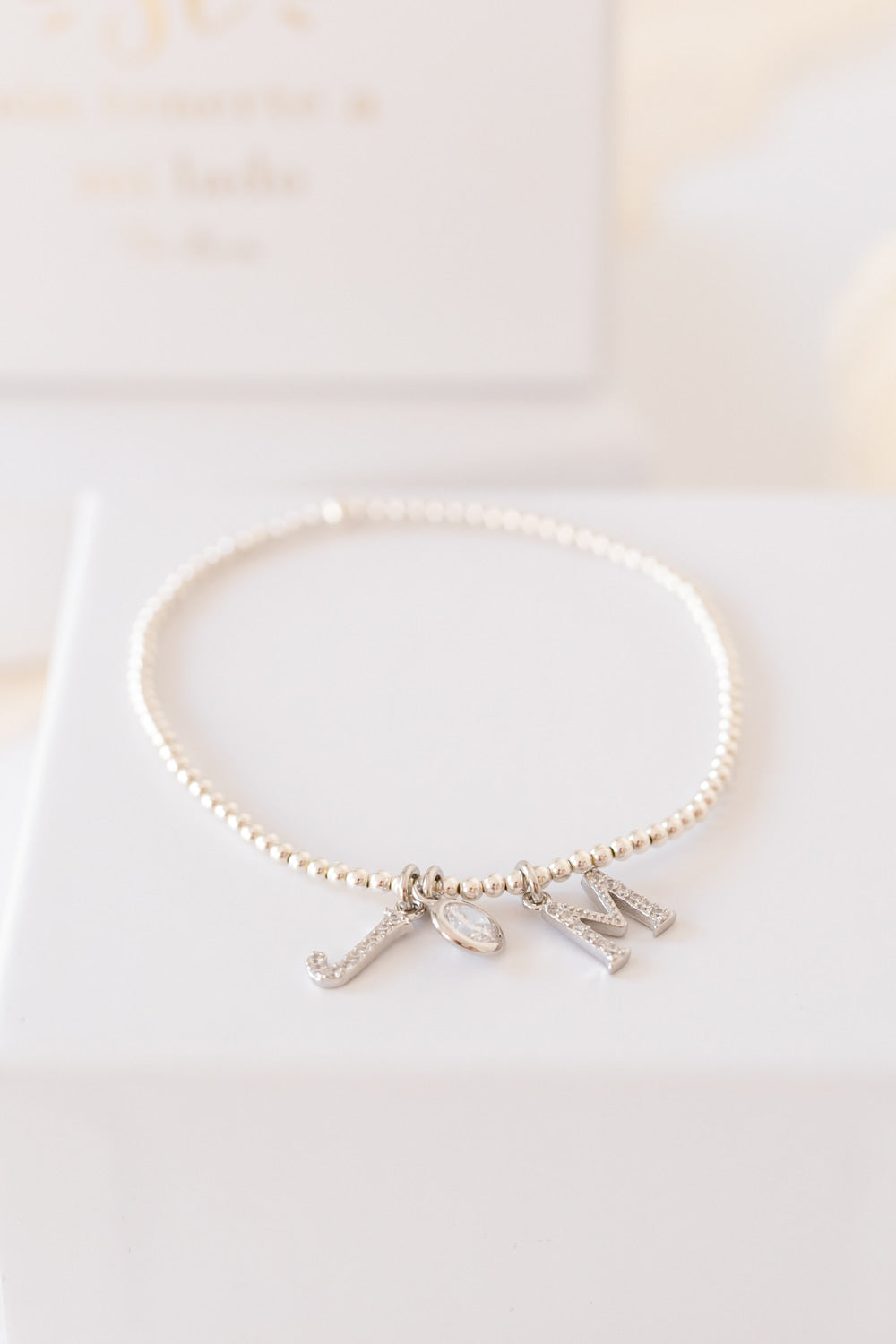 Pulsera de bolitas de plata. Puedes añadir una sola letra, la letra más la circonita o como en la fotografía, las 2 letras y su circonita.