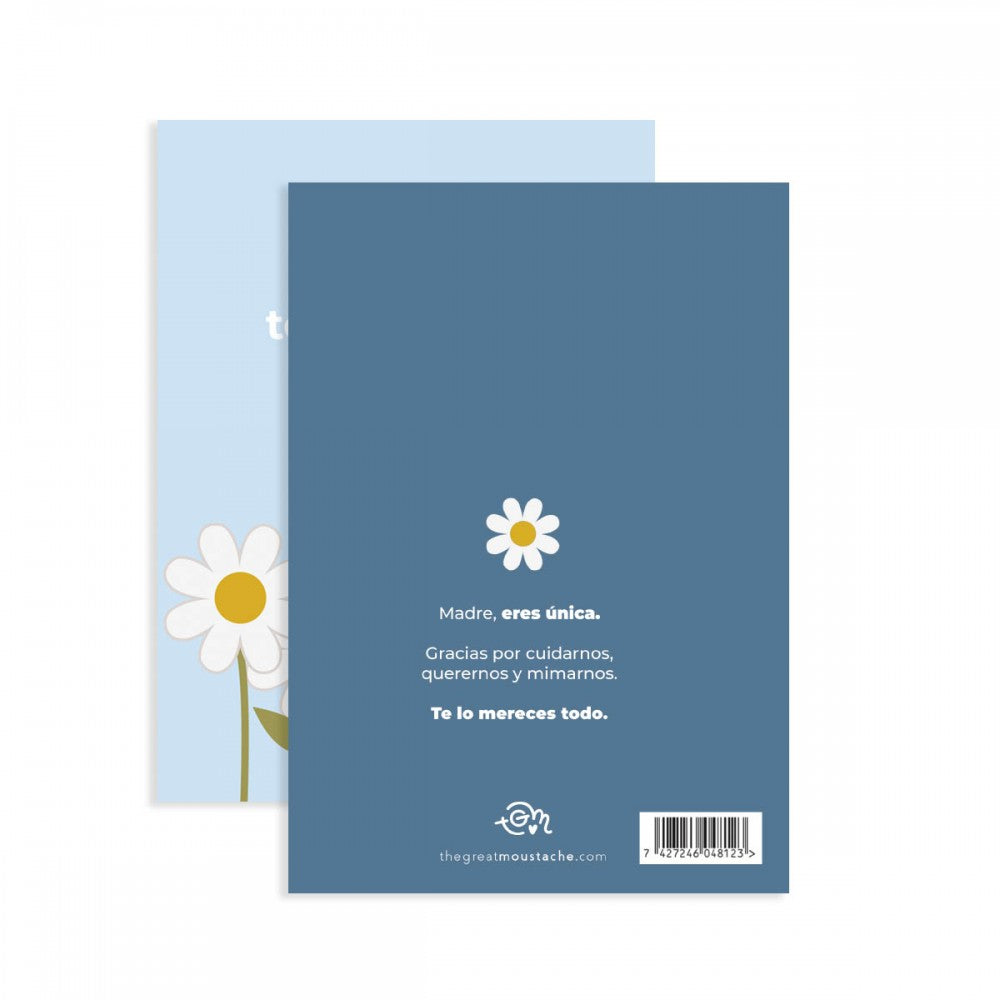 Tarjeta "MADRE TE LO MERECES TODO" en tamaño A6 de 300 gr. Papel de gran calidad e impresión.