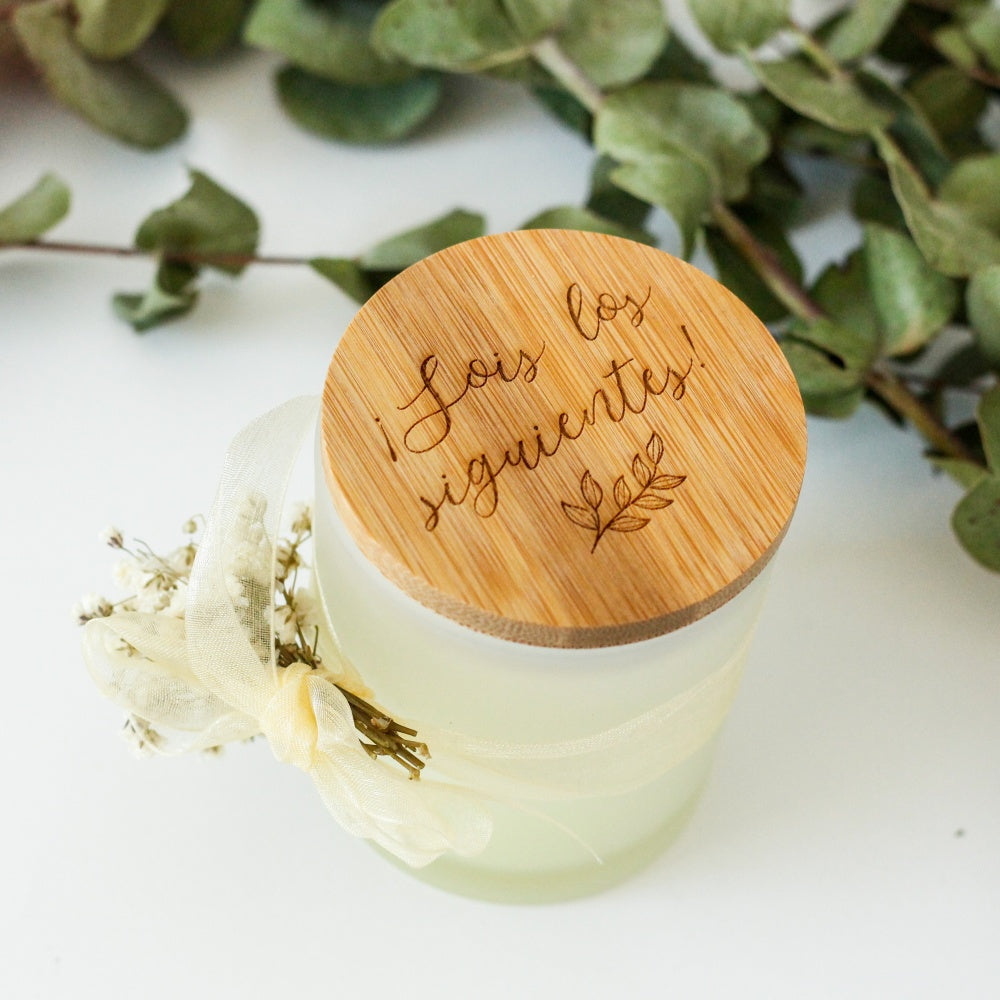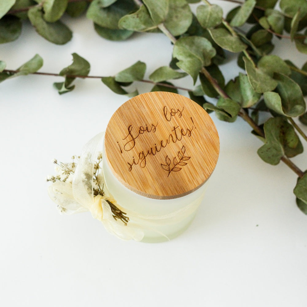 En vaso de cristal opaco y tapa de madera grabada con el mensaje Sois los siguientes.